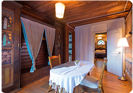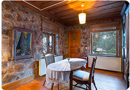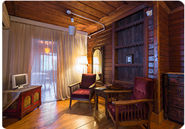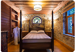 İçeriden bağlantılı kapısı ile yan yana iki odadan oluşan ve Köşkorman'ın ikinci katında bulunan Suit Odamız toplamda 36m² genişliğindedir. 9m² mermer küvetli banyosu bulunan odamızın ayrıca ormana açılan yaklaşık 70m² özel bahçesi mevcut olup, bahçede oturma grubu ve hamak yer almaktadır. Yaklaşık 18m² genişliğindeki ilk odada 1 adet çift kişilik yatak, mini buzdolabı, klima, TV yayını mevcuttur. Tavan yüksekliği 2,5 metreyi bulan odamızın duvarları taş kaplama, yerleri ve tavanı ise ahşap kaplamalıdır. |